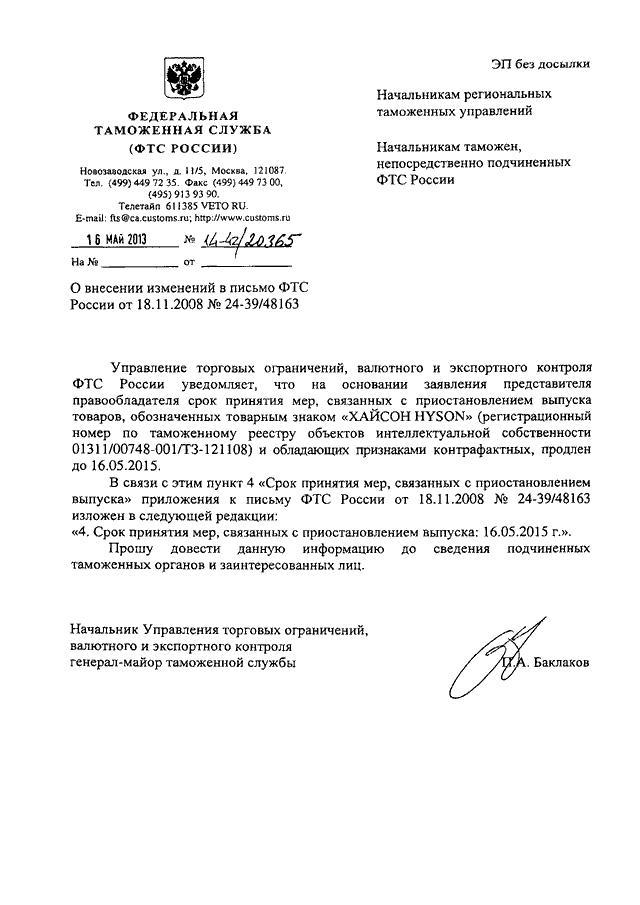 ПИСЬМО ФТС РФ от 16.05.2013 N 14-42/20365