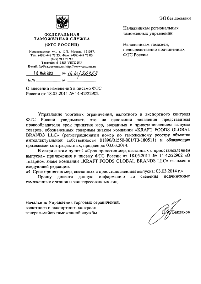 ПИСЬМО ФТС РФ от 16.05.2013 N 14-42/20363