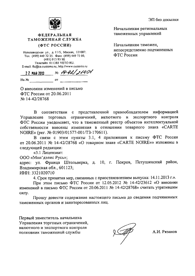 ПИСЬМО ФТС РФ от 22.05.2013 N 14-42/21401