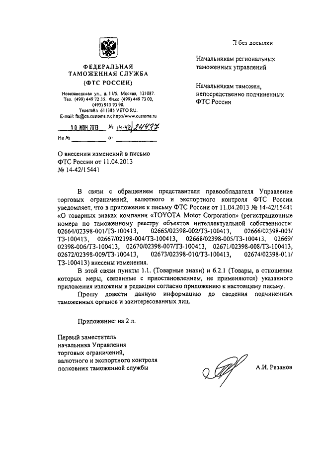 "О ВНЕСЕНИИ ИЗМЕНЕНИЙ В ПИСЬМО ФТС РОССИИ ОТ 11.04.2013 N 14-42/15441"
