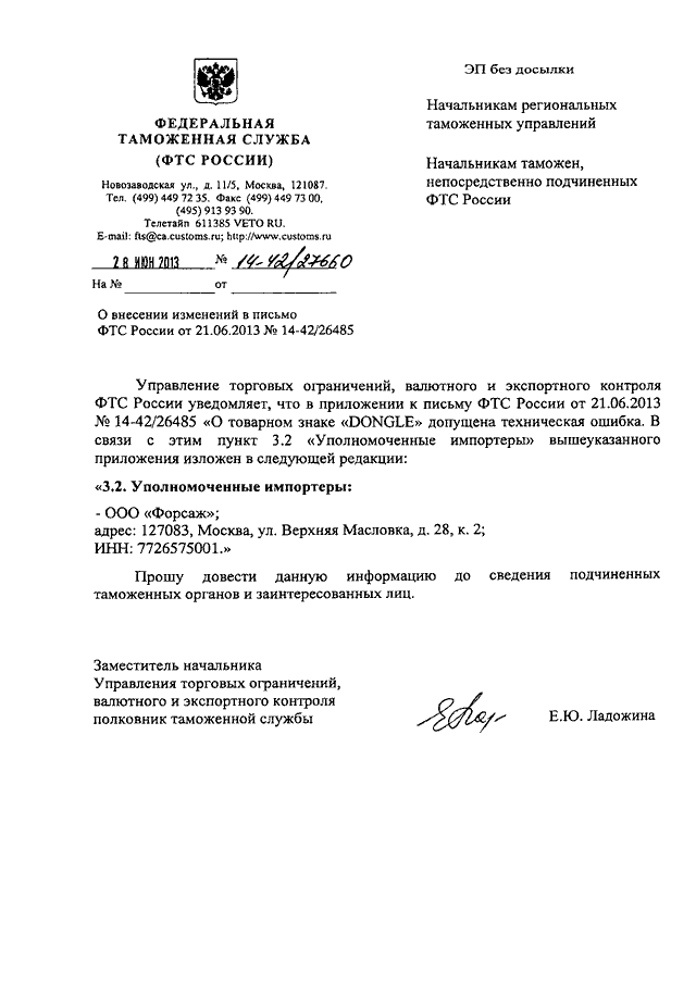 "О ВНЕСЕНИИ ИЗМЕНЕНИЙ В ПИСЬМО ФТС РОССИИ ОТ 21.06.2013 N 14-42/26485"