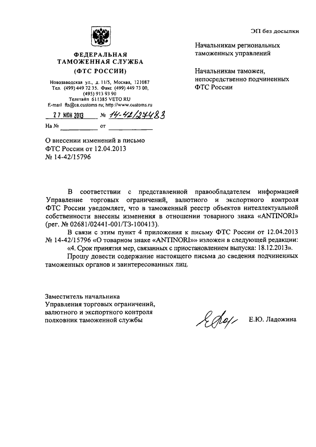 "О ВНЕСЕНИИ ИЗМЕНЕНИЙ В ПИСЬМО ФТС РОССИИ ОТ 12.04.2013 N 14-42/15796"