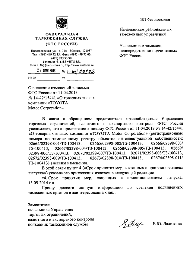 "О ВНЕСЕНИИ ИЗМЕНЕНИЙ В ПИСЬМО ФТС РОССИИ ОТ 11.04.2013 N 14-42/15441 "О ТОВАРНЫХ ЗНАКАХ КОМПАНИИ "TOYOTA MOTOR CORPORATION"