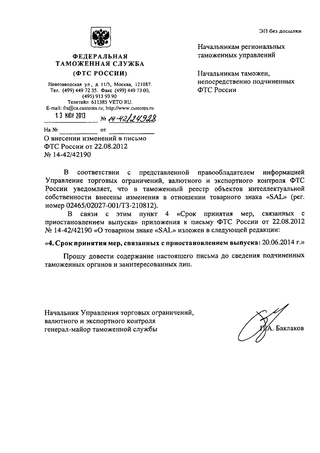 ПИСЬМО ФТС РФ от 13.06.2013 N 14-42/24928