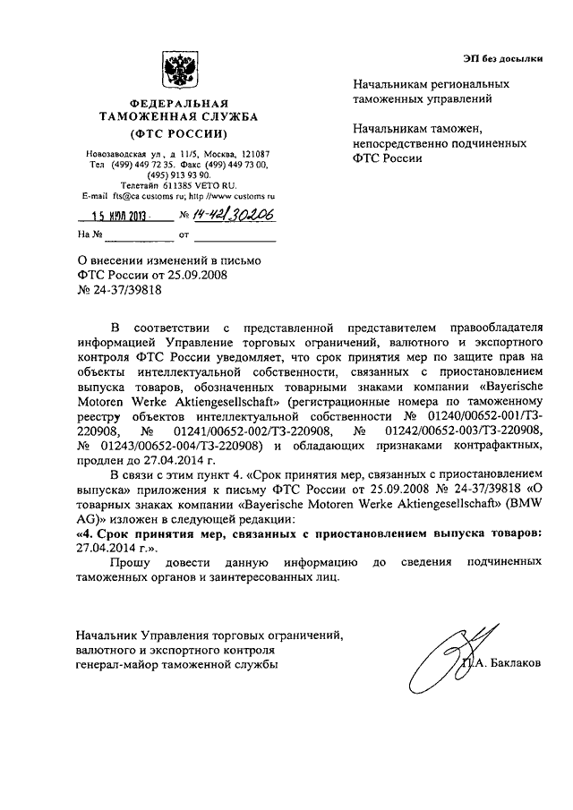 ПИСЬМО ФТС РФ от 15.07.2013 N 14-42/30206