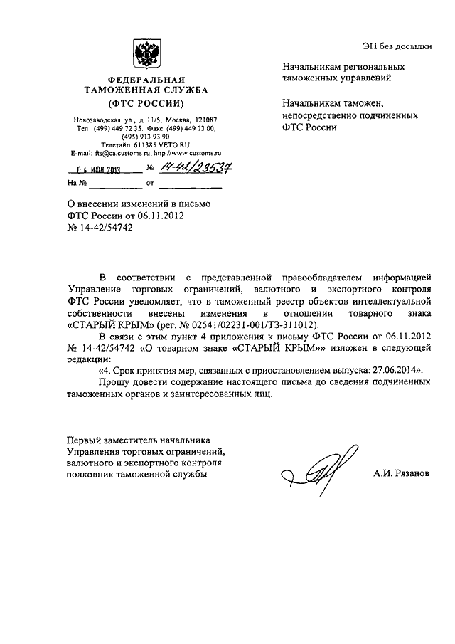 ПИСЬМО ФТС РФ от 04.06.2013 N 14-42/23537