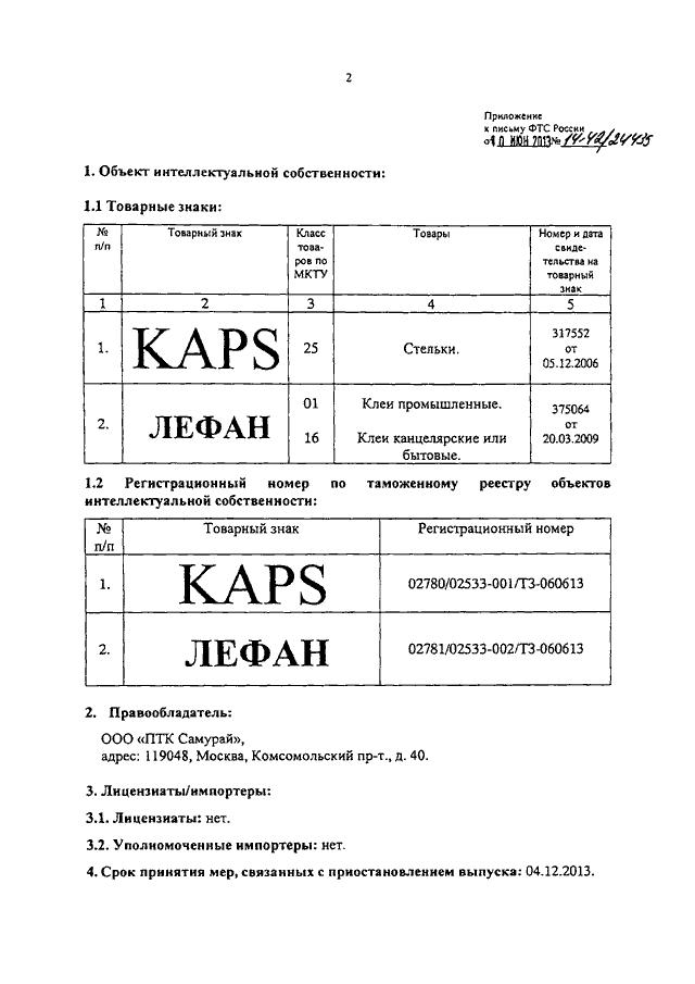"О ТОВАРНЫХ ЗНАКАХ ООО "ПТК САМУРАЙ"