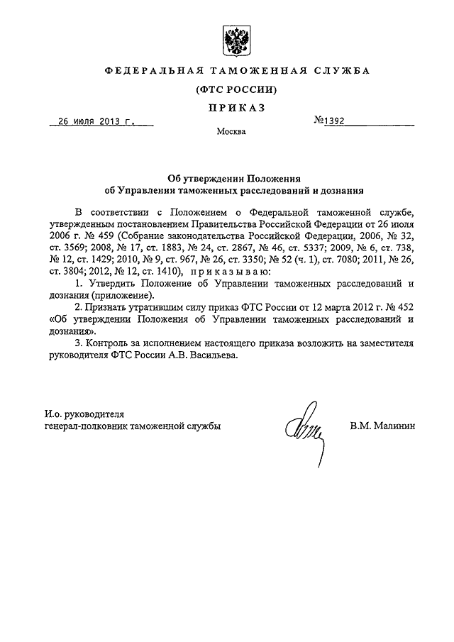 ПРИКАЗ ФТС РФ от 26.07.2013 N 1392