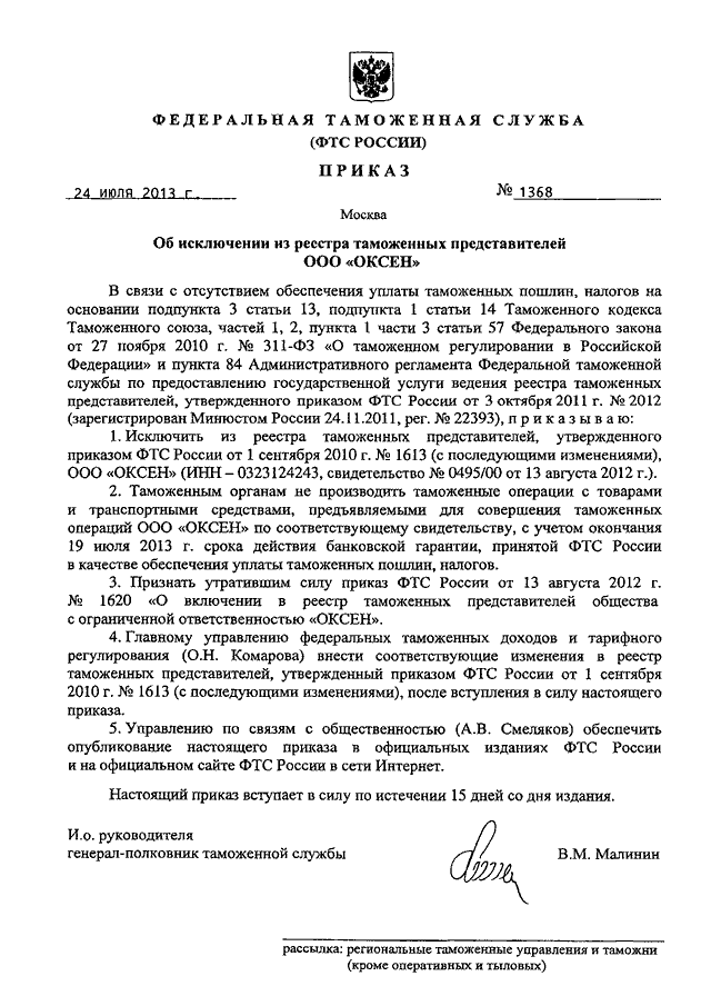 ПРИКАЗ ФТС РФ от 24.07.2013 N 1368