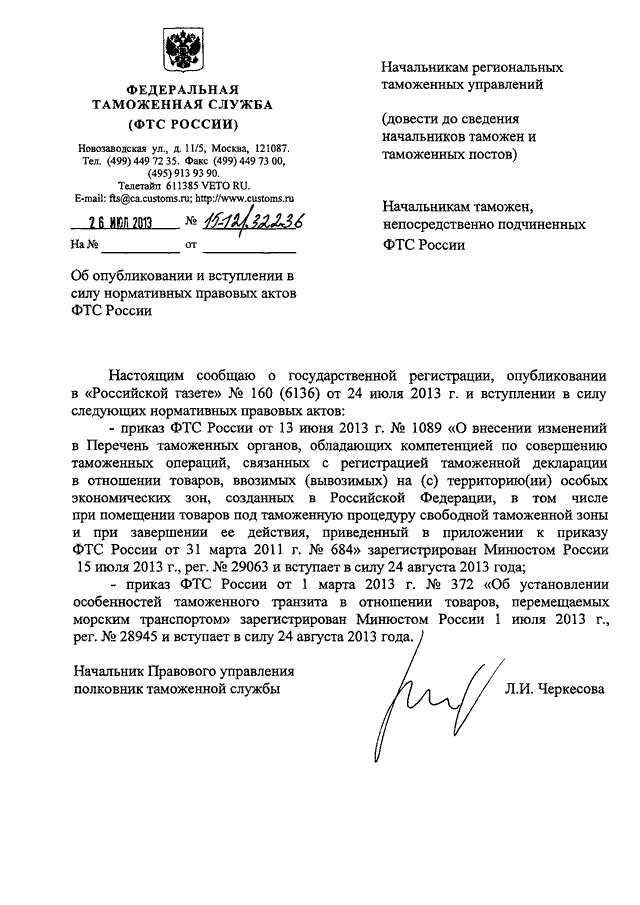 "ОБ ОПУБЛИКОВАНИИ И ВСТУПЛЕНИИ В СИЛУ НОРМАТИВНЫХ ПРАВОВЫХ АКТОВ ФТС РОССИИ"
