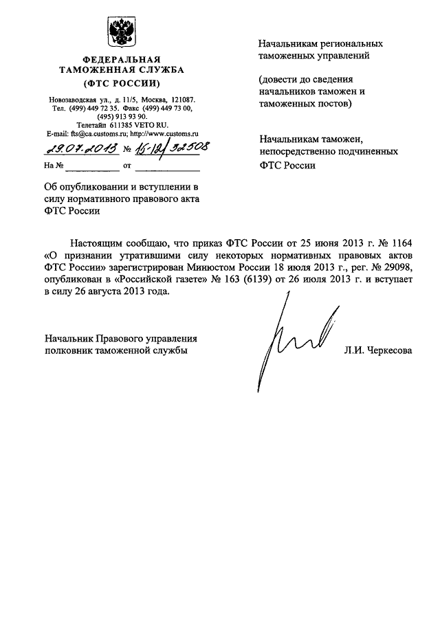 "ОБ ОПУБЛИКОВАНИИ И ВСТУПЛЕНИИ В СИЛУ НОРМАТИВНОГО ПРАВОВОГО АКТА ФТС РОССИИ"