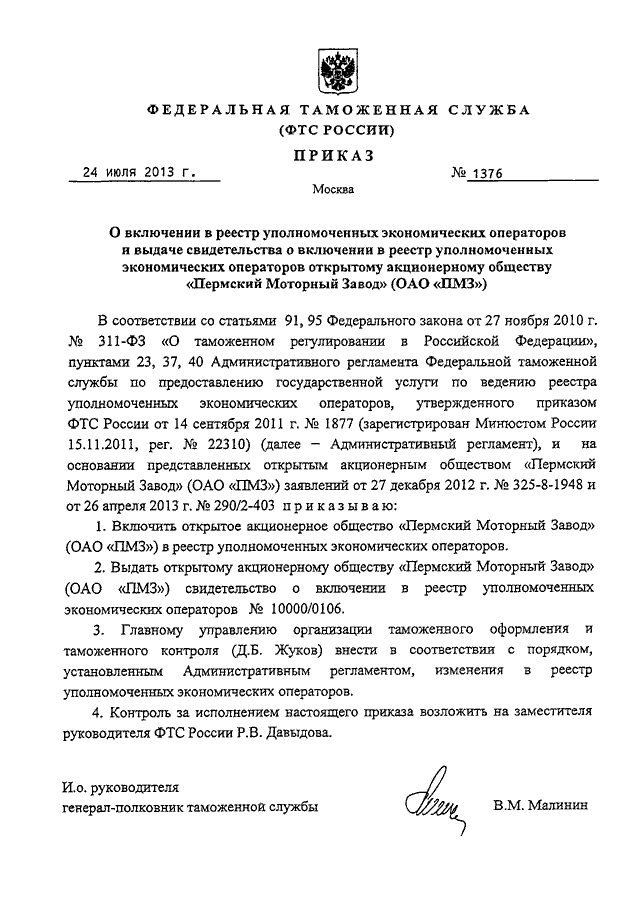 ПРИКАЗ ФТС РФ от 24.07.2013 N 1376 "О ВКЛЮЧЕНИИ В РЕЕСТР УПОЛНОМОЧЕННЫХ ЭКОНОМИЧЕСКИХ ОПЕРАТОРОВ И