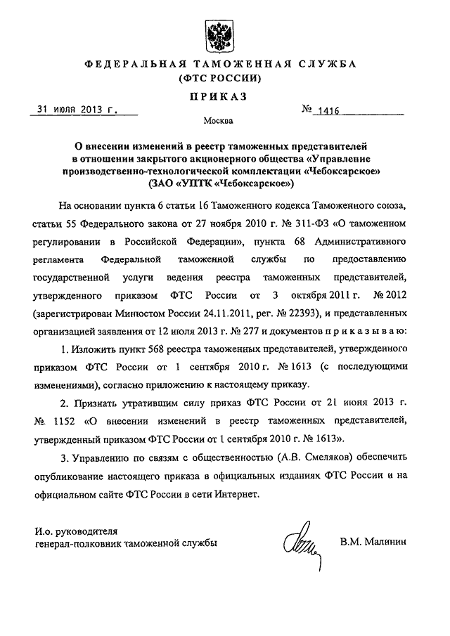ПРИКАЗ ФТС РФ от 31.07.2013 N 1416