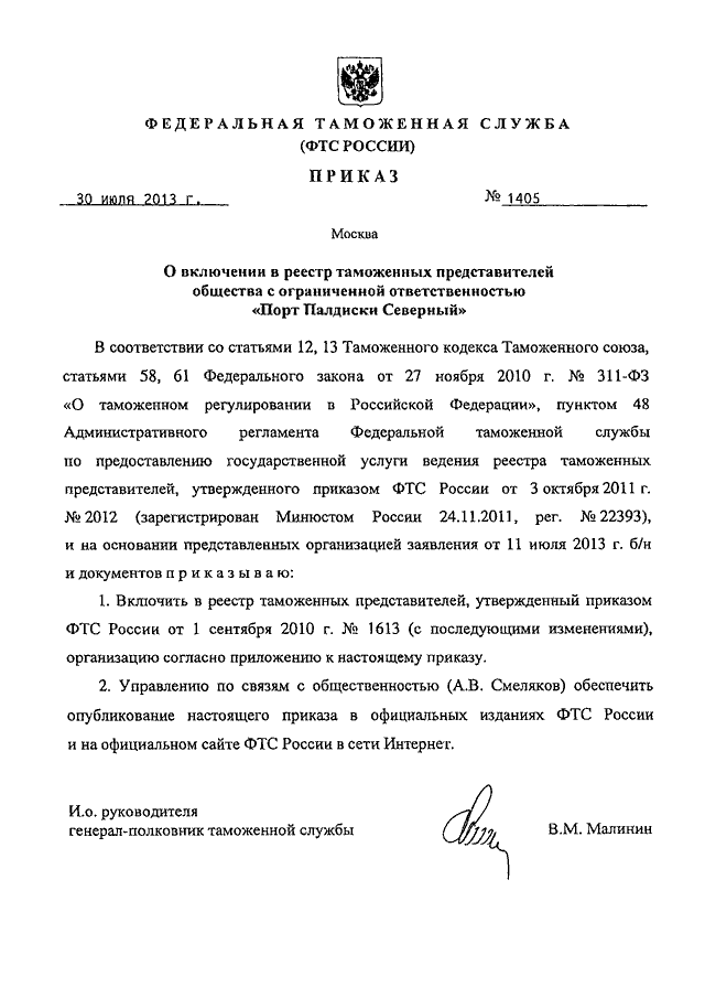 ПРИКАЗ ФТС РФ от 30.07.2013 N 1405