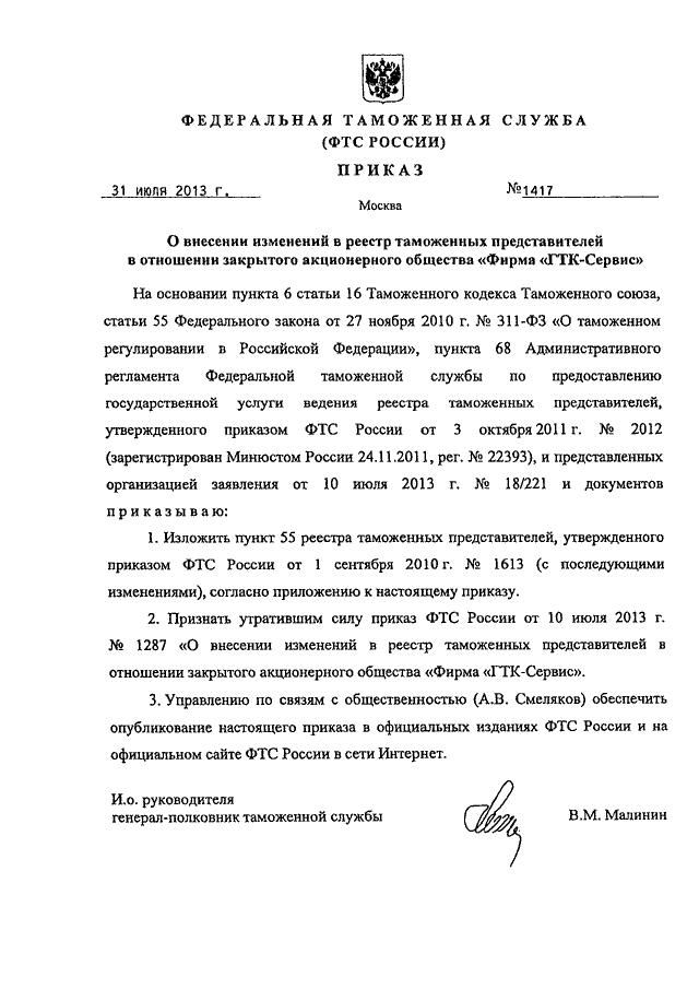 ПРИКАЗ ФТС РФ от 31.07.2013 N 1417