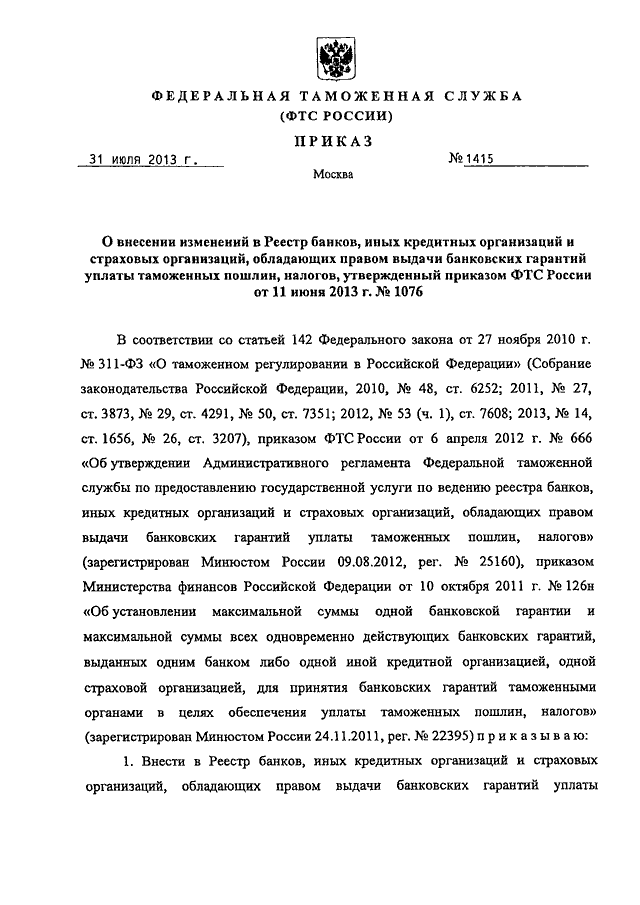 ПРИКАЗ ФТС РФ от 31.07.2013 N 1415 "О ВНЕСЕНИИ ИЗМЕНЕНИЙ В РЕЕСТР БАНКОВ, ИНЫХ КРЕДИТНЫХ ОРГАНИЗАЦИЙ