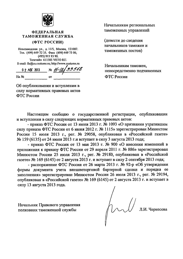 "ОБ ОПУБЛИКОВАНИИ И ВСТУПЛЕНИИ В СИЛУ НОРМАТИВНЫХ ПРАВОВЫХ АКТОВ ФТС РОССИИ"
