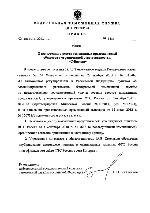 ПРИКАЗ ФТС РФ от 02.08.2013 N 1431