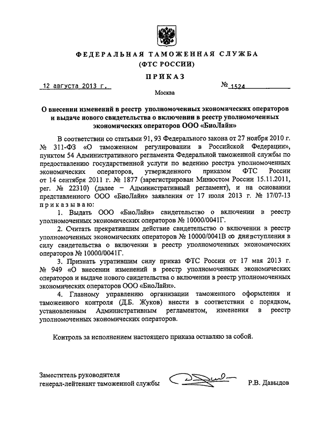 "О ВНЕСЕНИИ ИЗМЕНЕНИЙ В РЕЕСТР УПОЛНОМОЧЕННЫХ ЭКОНОМИЧЕСКИХ ОПЕРАТОРОВ И ВЫДАЧЕ НОВОГО СВИДЕТЕЛЬСТВА О ВКЛЮЧЕНИИ В РЕЕСТР УПОЛНОМОЧЕННЫХ ЭКОНОМИЧЕСКИХ ОПЕРАТОРОВ ООО "БИОЛАЙН"