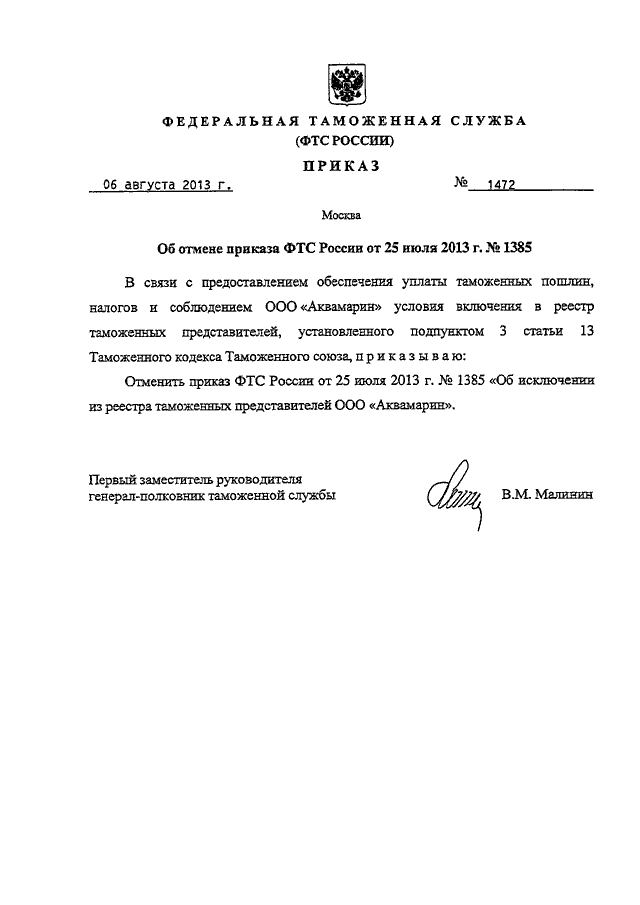 ПРИКАЗ ФТС РФ от 06.08.2013 N 1472