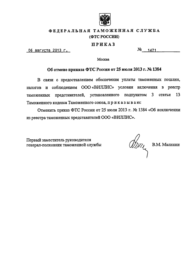 ПРИКАЗ ФТС РФ от 06.08.2013 N 1471