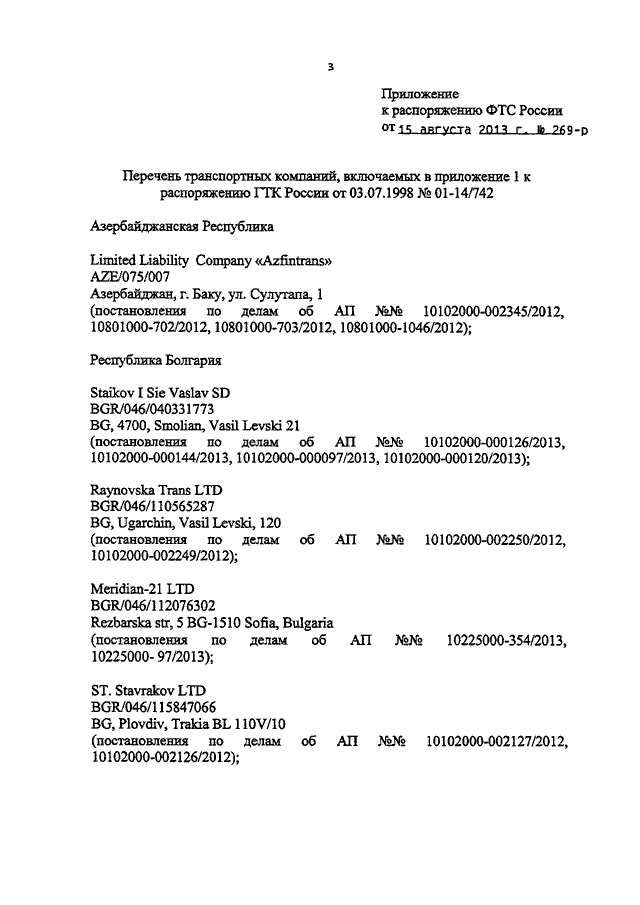 РАСПОРЯЖЕНИЕ ФТС РФ от 15.08.2013 N 269-р