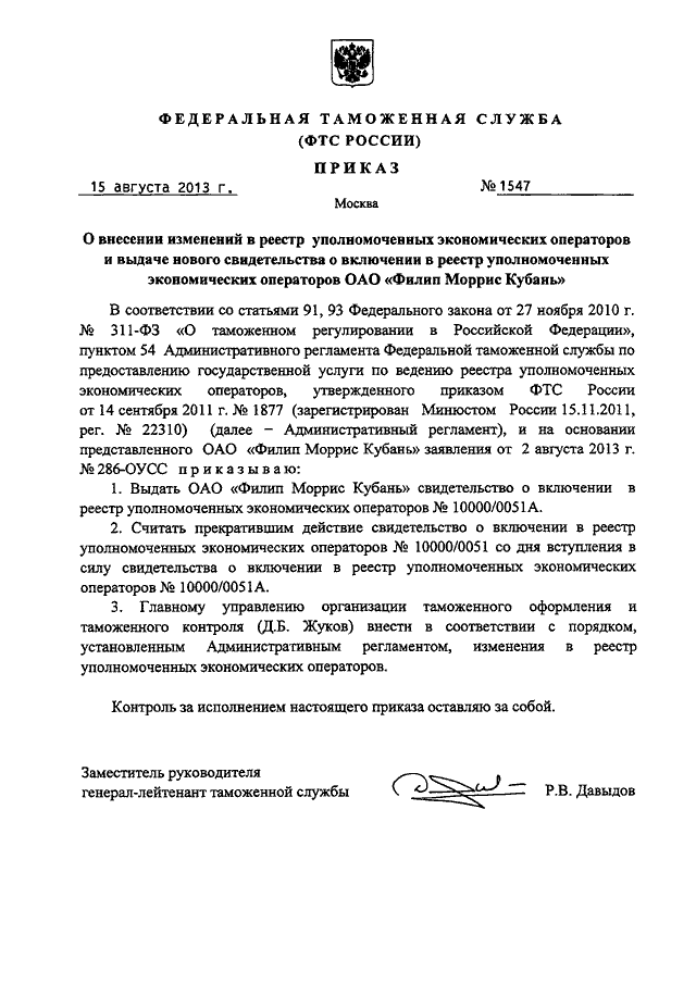 "О ВНЕСЕНИИ ИЗМЕНЕНИЙ В РЕЕСТР УПОЛНОМОЧЕННЫХ ЭКОНОМИЧЕСКИХ ОПЕРАТОРОВ И ВЫДАЧЕ НОВОГО СВИДЕТЕЛЬСТВА О ВКЛЮЧЕНИИ В РЕЕСТР УПОЛНОМОЧЕННЫХ ЭКОНОМИЧЕСКИХ ОПЕРАТОРОВ ОАО "ФИЛИП МОРРИС КУБАНЬ"
