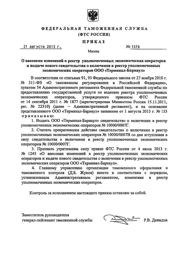 "О ВНЕСЕНИИ ИЗМЕНЕНИЙ В РЕЕСТР УПОЛНОМОЧЕННЫХ ЭКОНОМИЧЕСКИХ ОПЕРАТОРОВ И ВЫДАЧЕ НОВОГО СВИДЕТЕЛЬСТВА О ВКЛЮЧЕНИИ В РЕЕСТР УПОЛНОМОЧЕННЫХ ЭКОНОМИЧЕСКИХ ОПЕРАТОРОВ ООО "ТЕРМИНАЛ-БАРНАУЛ"