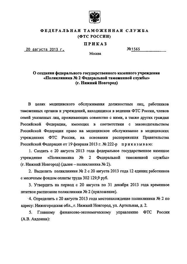 "О СОЗДАНИИ ФЕДЕРАЛЬНОГО ГОСУДАРСТВЕННОГО КАЗЕННОГО УЧРЕЖДЕНИЯ "ПОЛИКЛИНИКА N 2 ФЕДЕРАЛЬНОЙ ТАМОЖЕННОЙ СЛУЖБЫ" (Г. НИЖНИЙ НОВГОРОД)"