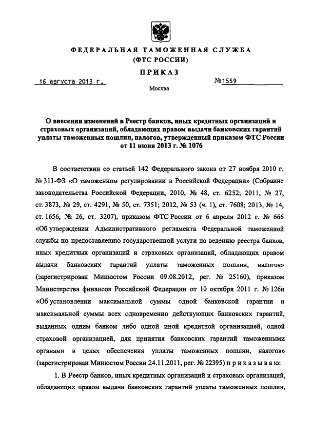 ПРИКАЗ ФТС РФ от 16.08.2013 N 1559