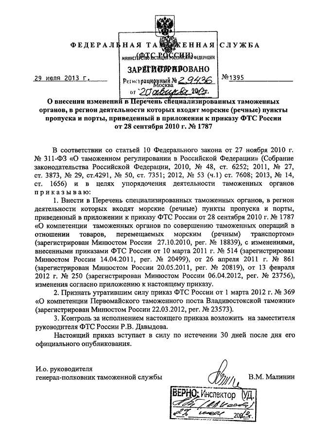 ПРИКАЗ ФТС РФ от 29.07.2013 N 1395