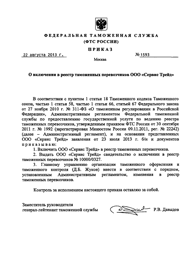 ПРИКАЗ ФТС РФ от 22.08.2013 N 1593