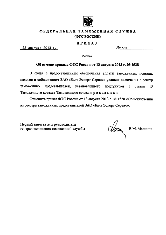 ПРИКАЗ ФТС РФ от 22.08.2013 N 1591