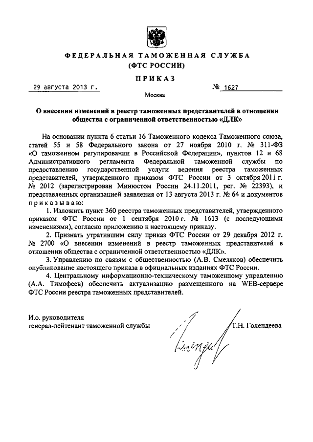 ПРИКАЗ ФТС РФ от 29.08.2013 N 1627