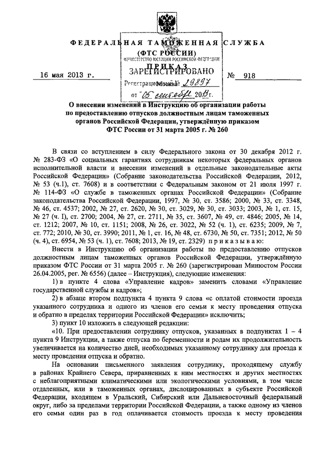 ПРИКАЗ ФТС РФ от 16.05.2013 N 918