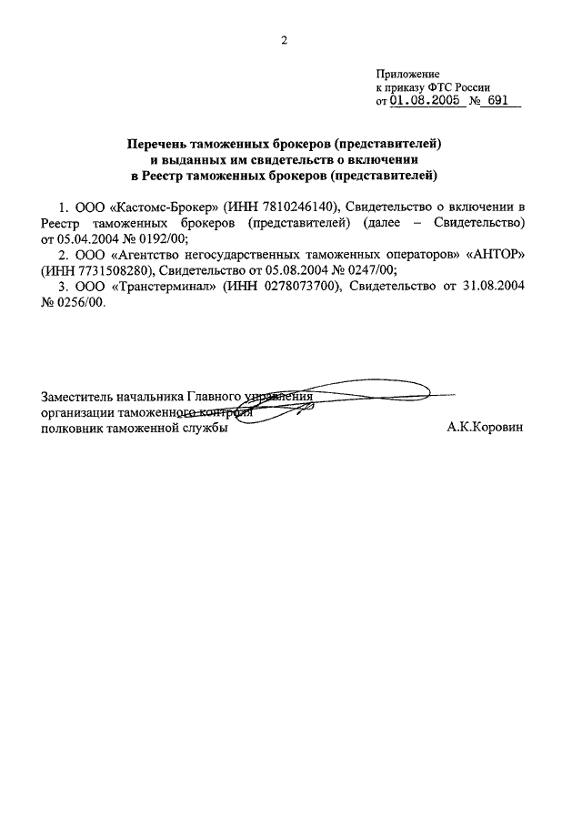 ПРИКАЗ ФТС РФ от 01.08.2005 N 691