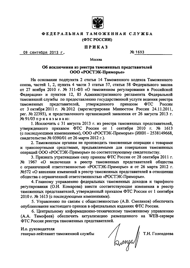 ПРИКАЗ ФТС РФ от 09.09.2013 N 1693