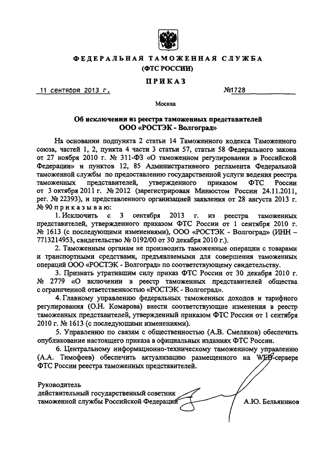 ПРИКАЗ ФТС РФ от 11.09.2013 N 1728