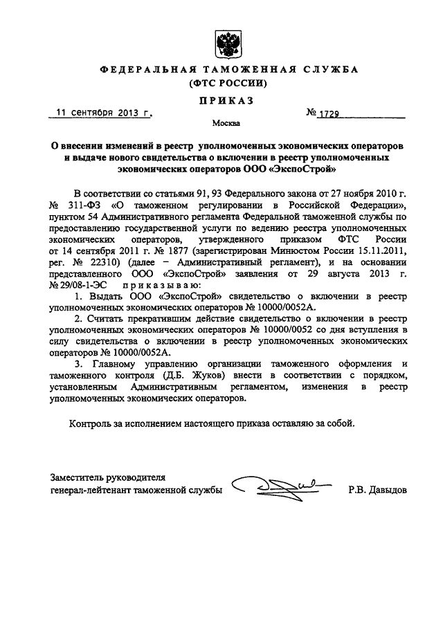 ПРИКАЗ ФТС РФ от 11.09.2013 N 1729