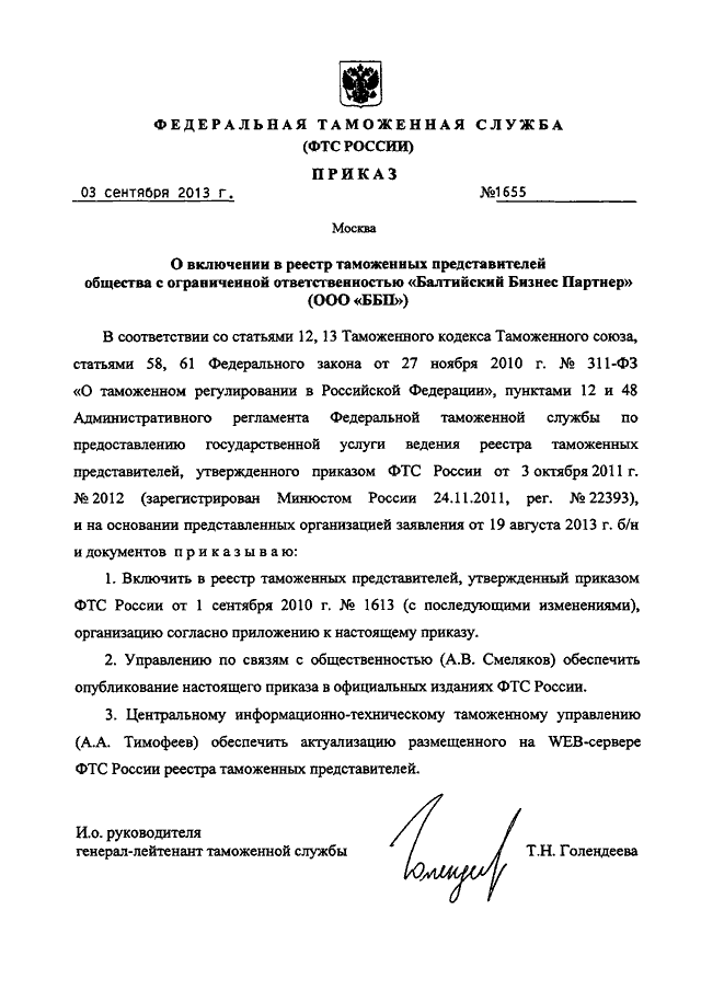 ПРИКАЗ ФТС РФ от 03.09.2013 N 1655