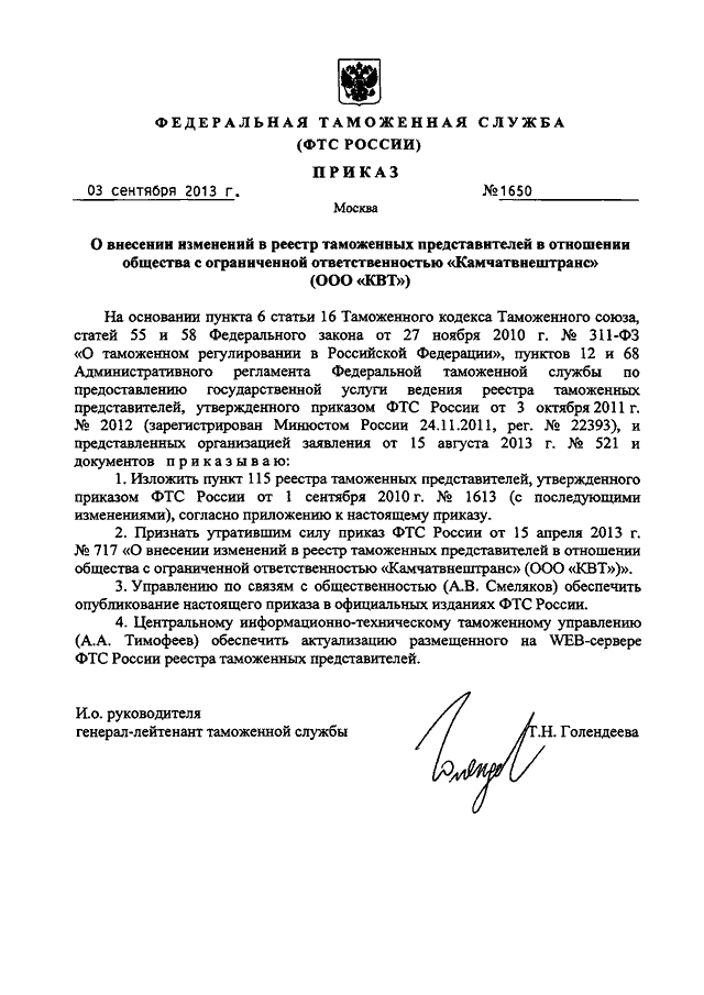 ПРИКАЗ ФТС РФ от 03.09.2013 N 1650