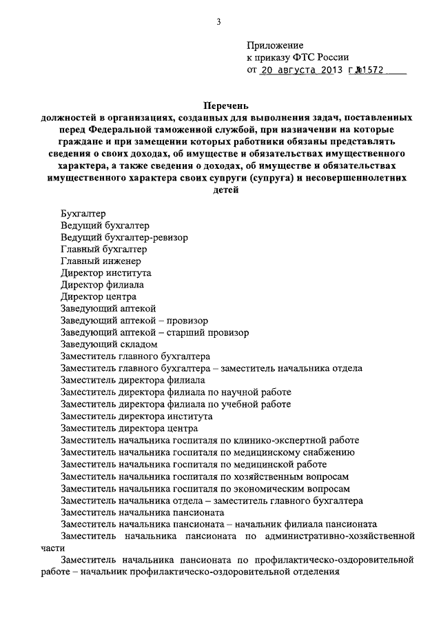 ПРИКАЗ ФТС РФ от 20.08.2013 N 1572 "О ПЕРЕЧНЕ ДОЛЖНОСТЕЙ В ОРГАНИЗАЦИЯХ, СОЗДАННЫХ ДЛЯ ВЫПОЛНЕНИЯ
