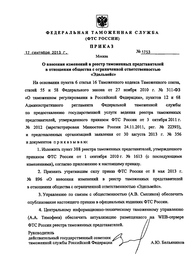 ПРИКАЗ ФТС РФ от 17.09.2013 N 1753