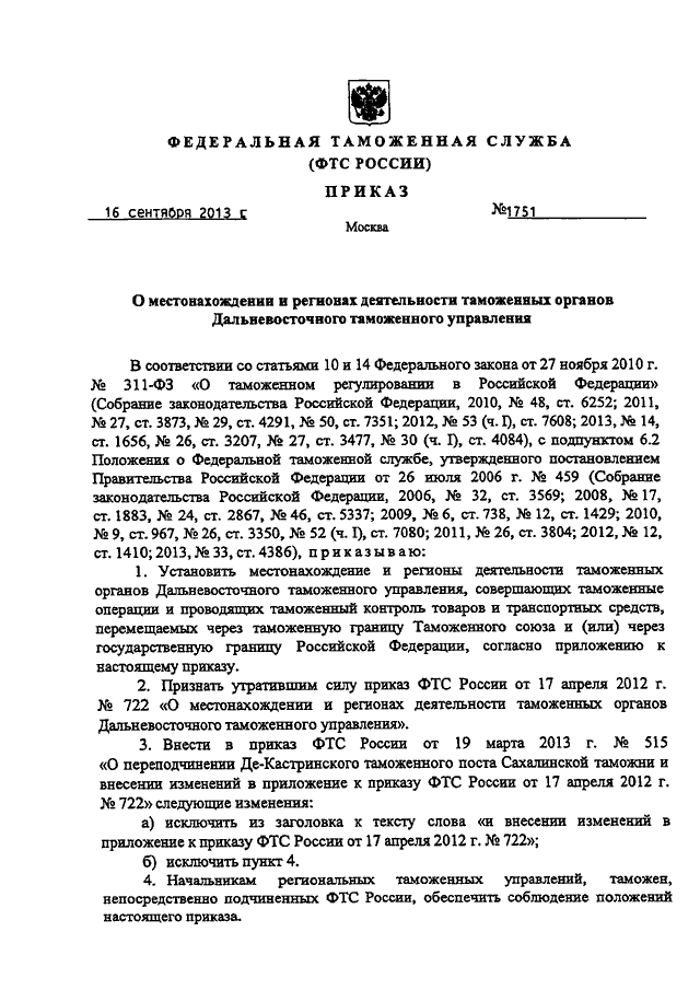 ПРИКАЗ ФТС РФ от 16.09.2013 N 1751