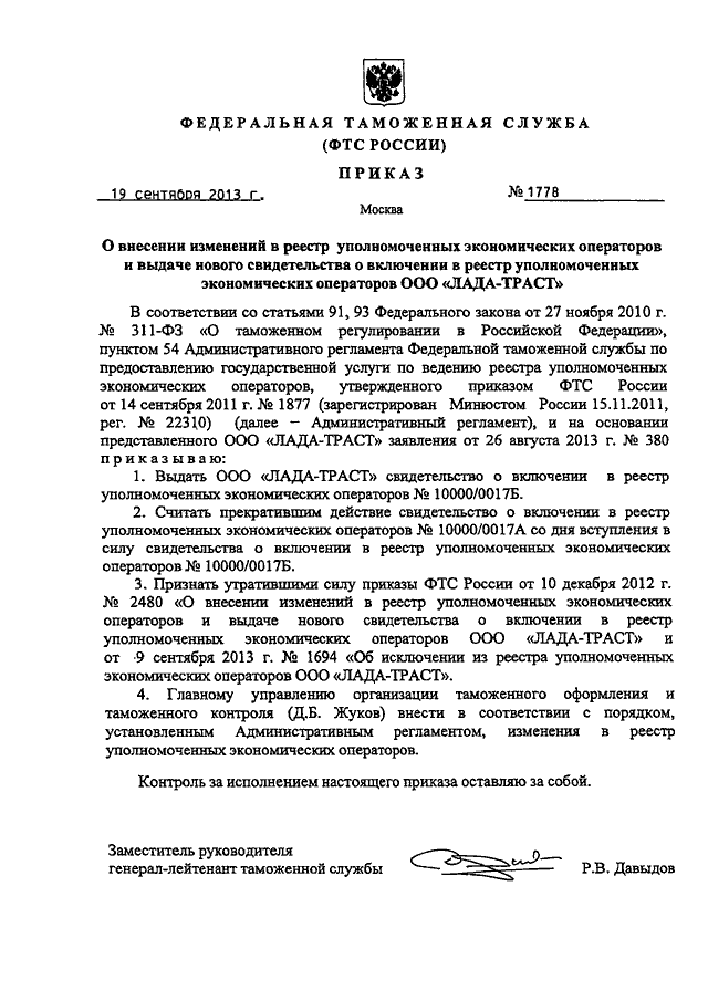 ПРИКАЗ ФТС РФ от 19.09.2013 N 1778