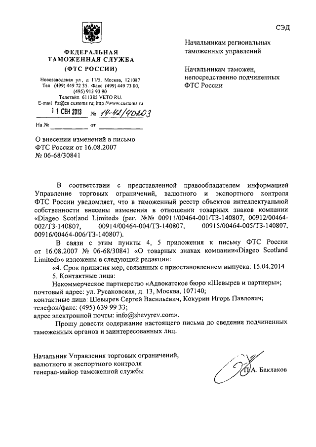 ПИСЬМО ФТС РФ от 11.09.2013 N 14-42/40203