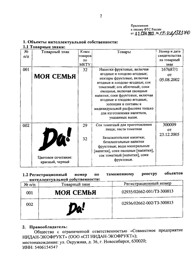 "О ТОВАРНЫХ ЗНАКАХ ООО "СП "НИДАН-ЭКОФРУКТ"