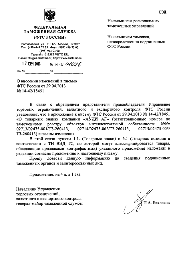 "О ВНЕСЕНИИ ИЗМЕНЕНИЙ В ПИСЬМО ФТС РОССИИ ОТ 29.04.2013 N 14-42/18451"