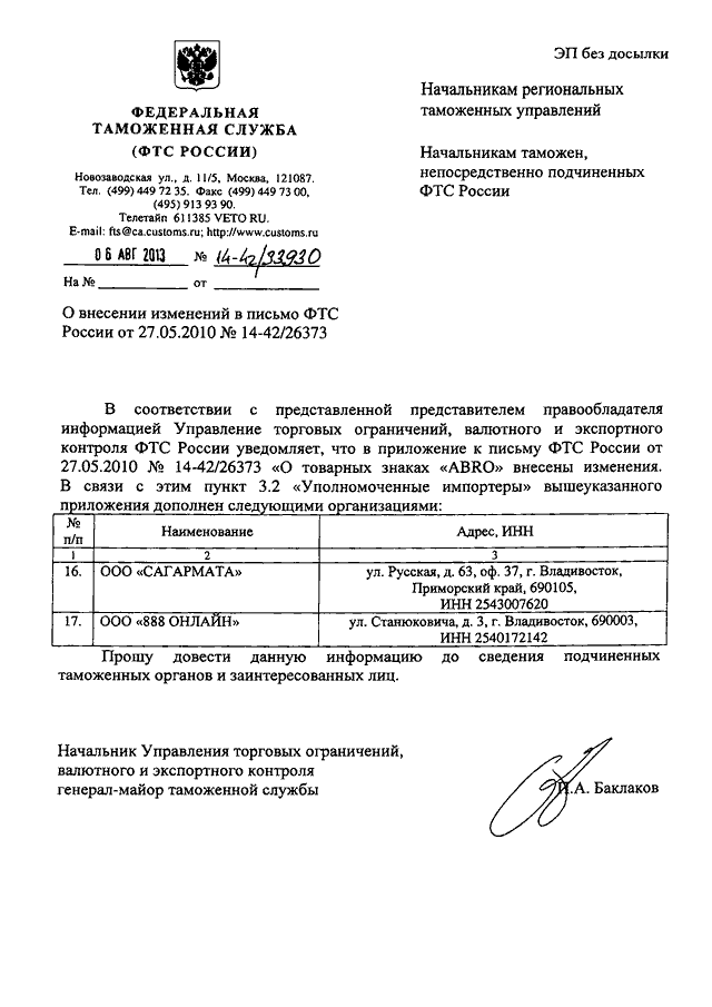 "О ВНЕСЕНИИ ИЗМЕНЕНИЙ В ПИСЬМО ФТС РОССИИ ОТ 27.05.2010 N 14-42/26373"