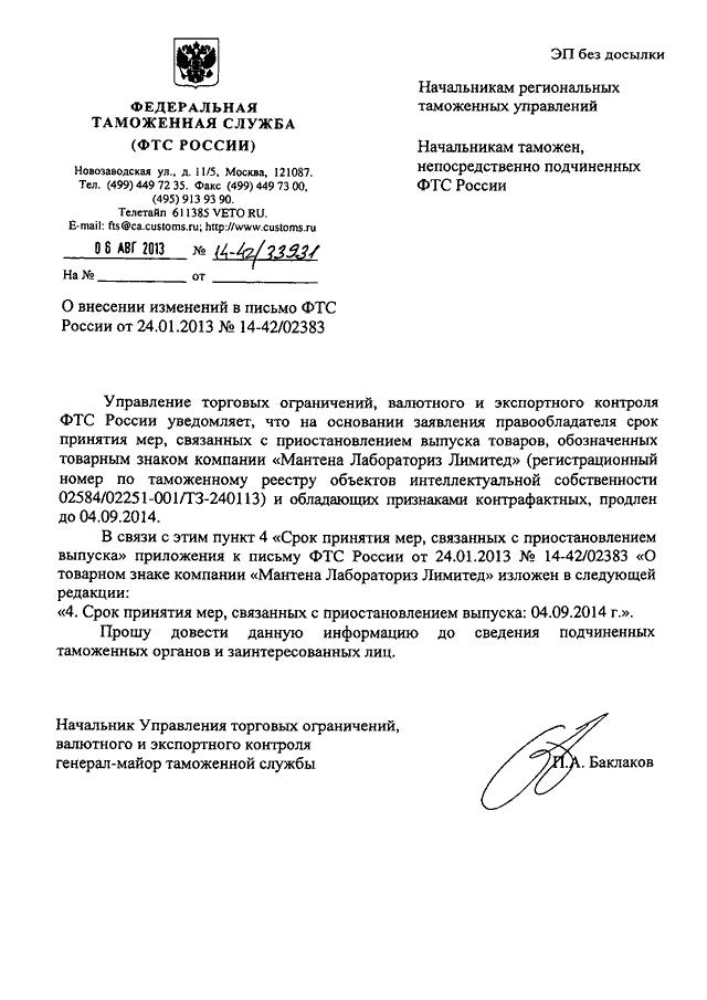 ПИСЬМО ФТС РФ от 06.08.2013 N 14-42/33931